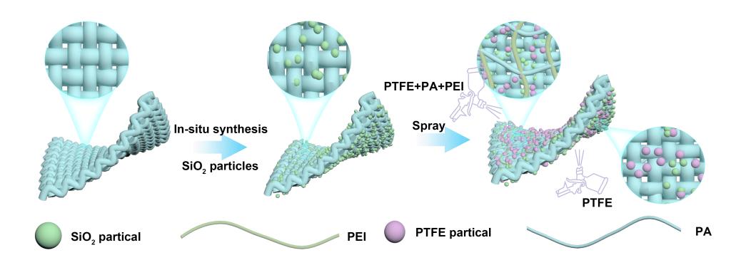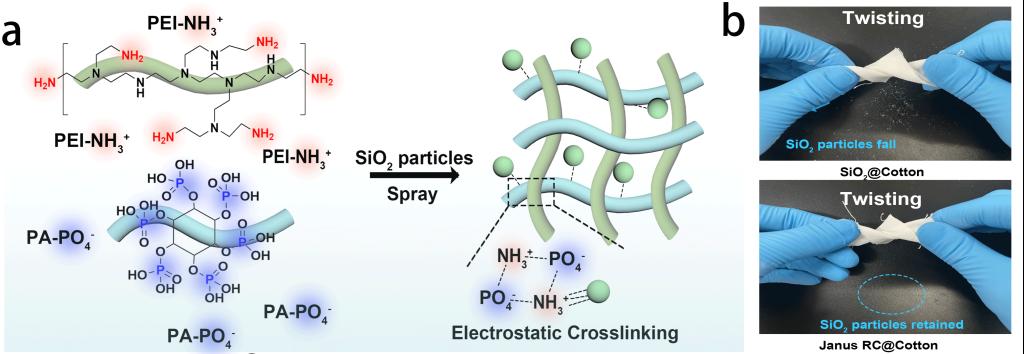 生态染整技术研究室余圆圆副教授、王强教授团队在Chemical Engineering Journal期刊上发表了题为“Excellent durability and multifunctional textiles with dual-mode evaporative and radiative cooling enabled by in-situ growth of SiO2and electrostatic network coating”的研究成果,23级硕士研究生张露璇为论文第一作者(//doi.org/10.1016/j.cej.2025.168259)。本研究设计了一种基于棉织物的新型辐射/蒸发双模式冷却纺织品(Janus RC@Cotton)。首先,在棉纤维表面原位生长SiO2粒子和喷涂PTFE,制备具有双窗口辐射制冷功能的SiO2@Cotton。然后,在此基础上,利用聚乙烯亚胺(PEI)/植酸(PA)静电网络在SiO2@Cotton辐射制冷织物的不同侧构建不对称的润湿性,使其具有优异的单向导湿效果,提升织物的吸湿排汗性能,增强蒸发制冷效果,进一步提升织物的降温能力(图1)。另外,静电涂层网络还赋予了多功能织物优异的耐久性(图2)和高效的抗菌性能。