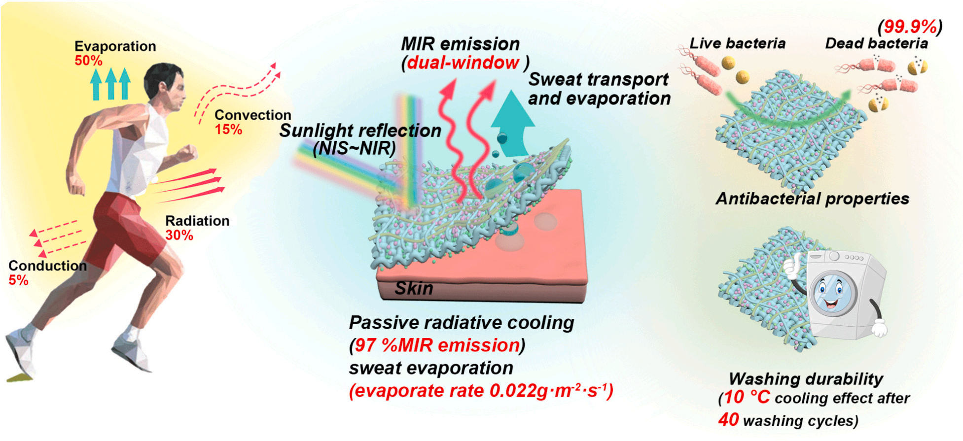 结果表明,在室内,潮湿状态下的Janus RC@Cotton比干燥状态温度下降了6.6 ℃。Janus RC@Cotton相比于未处理棉织物最大能实现9 ℃的降温。在室外,Janus RC@Cotton相比于未处理棉织物最大能实现8 ℃的降温。在皮肤出汗的条件下,Janus RC@Cotton可以实现优异的亚环境冷却(8.3 ℃)。Janus RC@Cotton具有优异的耐久性,在40次洗涤后仍然保持10 ℃左右的降温效果。同时,静电涂层网络赋予了织物高效的抗菌性能,对大肠杆菌和金黄色葡萄球菌的抗菌率达到99.9%。