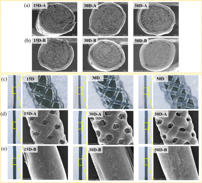 图1 CF/TPU(15D、30D和50D)纱线形貌(a)软化态横截面;(b)熔融态横截面;(c)编织态表面;(d)软化态表面;(e)熔融态表面