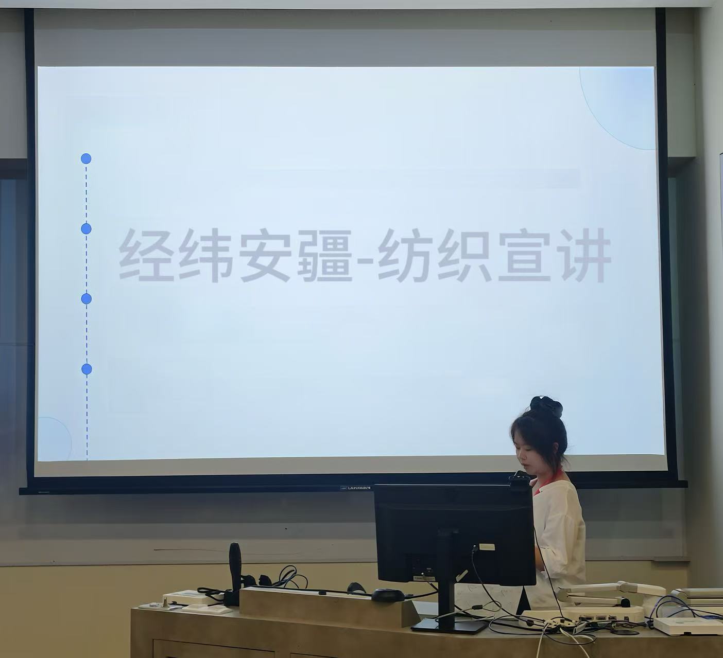 江宝怡同学在新疆阿拉尔青松路街道开展宣讲,详细阐述纺织业对边疆稳定和民族团结的重要性,介绍新疆纺织业对经济发展、民生改善的作用,同时阐释产业繁荣稳定对国家安全的支撑作用。她感慨道“通过宣讲,我们希望将国家安全观融入具体产业故事,让听众更好地理解其重要性。”