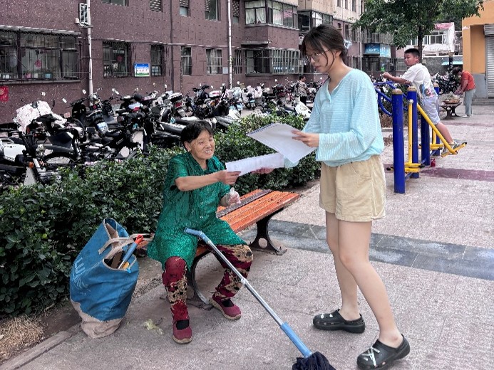 贾静筠同学赴山西临汾市安泽县书香名邸社区,以垃圾分类宣传为核,创新制作动画视频、设计主题海报并嵌入二维码,深入社区分发呼吁,让环保知识鲜活起来。