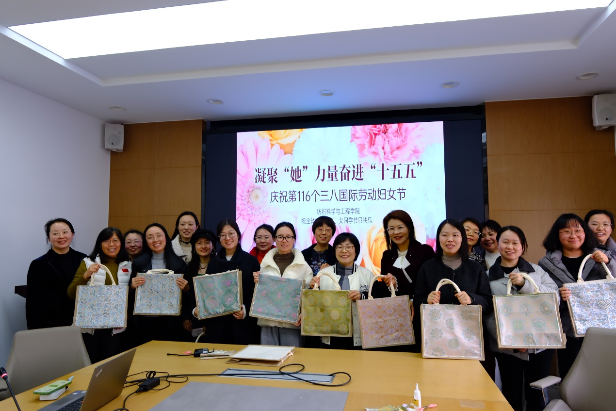 大家欢聚一堂,亲手制作精美手串与非遗宋锦DIY手工包,在一针一线、一穿一搭中感受手工创作的乐趣,体验非遗文化的独特韵味。现场氛围温馨融洽,女教职工们在动手实践中放松身心、增进交流,既收获了亲手制作的暖心作品,也感受到了学院浓浓的节日关怀与祝福。