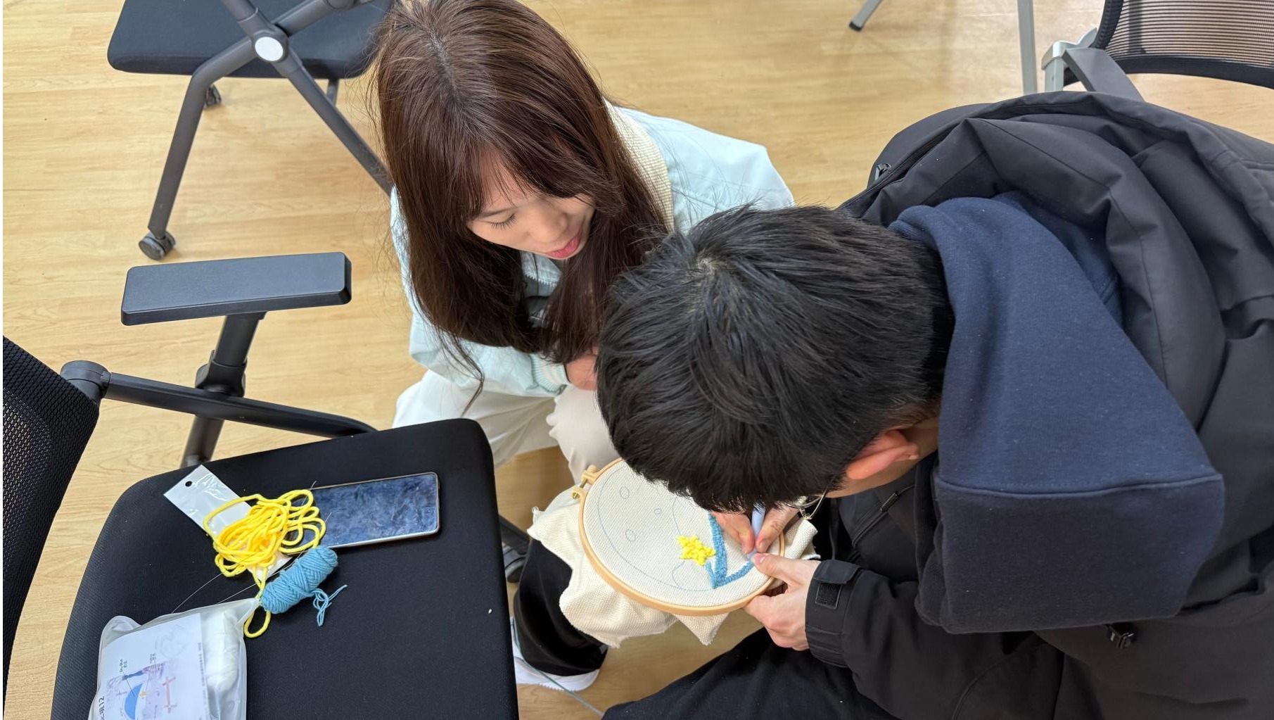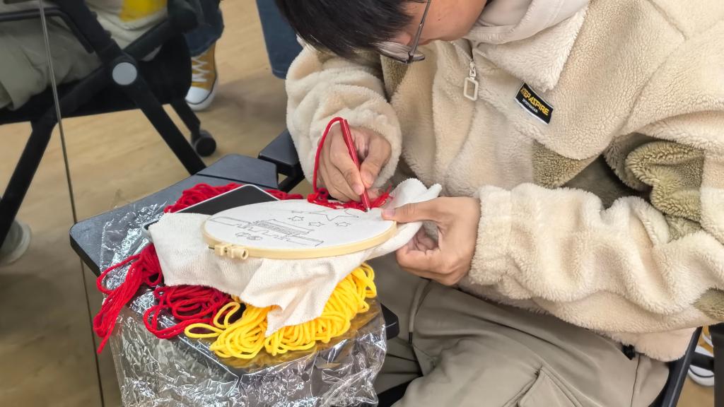 科普环节落幕,纺织戳戳乐创作正式启幕。同学们以针为笔、以线为媒,将红色文化、报国情怀融入创作,精心甄选底稿、搭配彩线,在工作人员指导下执针穿梭、层层堆叠,让精美图案跃然布面。现场氛围热烈温馨、创意涌动,大家把红色信仰织进经纬,将匠心初心注入作品,红色主题纹样与创意图案相映成趣,件件作品饱含赤诚、栩栩如生,既彰显青年创新活力,又尽显纺织工艺之美。