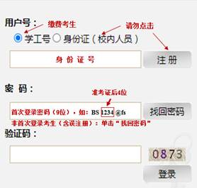 网上缴费平台”,完成缴费。考生账号已开通,切勿自行注册。收费标准:80元/生(仅申请考核考生,硕博连读考生无须缴费)。用户号在“学工号”输入正确的身份证号,初始密码(9位):“BS”+准考证编号后4位+“@fs”(准考证查看网址://yzgmis.91gczx.com/zsgl/bswb/login.aspx),如“BS1234@fs”。非首次登录缴费系统的考生(含往年报考考生及误注册考生)请使用“找回密码”,登录并缴费。